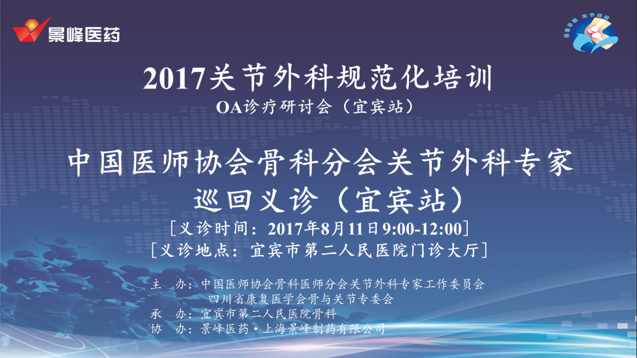 2017年8月11日,由中国医师协会骨科医师分会、四川省康复医学会骨与关节专委会、宜宾市第二人民医院骨科共同主办,景峰医药·上海景峰制药有限公司协办的“2017关节外科规范化培训-OA诊疗研讨会(宜宾站)”和“中国医师协会骨科分会关节外科专家巡回义诊(宜宾站)”在素有“万里长江第一城”和“中国酒都”之称的宜宾成功举办。
